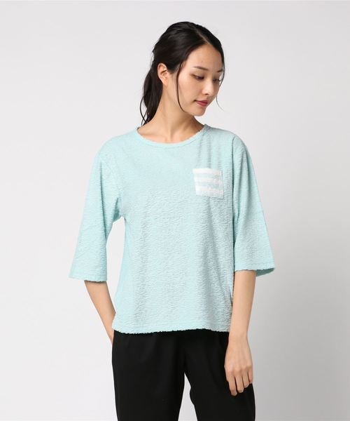 表面の凹凸感が特徴的な、パイル素材のウェアシリーズ。パイル素材は吸水性も良く透過性も低いので、これからの時期におすすめです。色は涼しげなアースカラーのブルー・カーキの2色展開。7分袖トップスは胸ポケットのボーダーがポイント。18スラブパイルボーダーシリーズと組み合わせたコーデもおすすめ。
