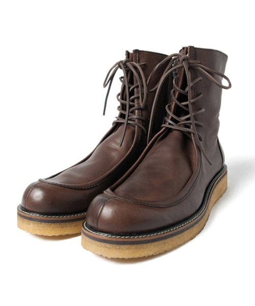 ●お届け予定:2014年3月上旬 ●予約受付:11月18日(月)AM10:00まで。 ※工場生産の関係上、納期が変更になる場合がございます。 発送日の前後については予めご了承ください。 合わせるボトムスで様相に変化を持たせる事が可能な1足、Moriarty boots<モリアーティブーツ>。アメリカンカジュアルの定番として愛されるモックトゥシューズをソースに再構築したこちら、靴紐を縛る強弱でタイトなボトムスをブーツインするスタイルも可能な仕様としました。採用したクレープソールとアッパーの相性は抜群、クッション性を備えた履き心地にあなたも酔いしれる筈。ブランドのシュークラフトお馴染みのサイドジップで着脱も容易です。往年のディテールをアーバンライクに昇華したこちら、あなたのワードローブに是非加えて。 ※画像の商品はサンプルです。 実際の商品と仕様、加工、サイズが若干異なる場合があります。 ※納期の異なる予約商品、その他ブランドの予約商品、 通常商品との同時決済はできません。