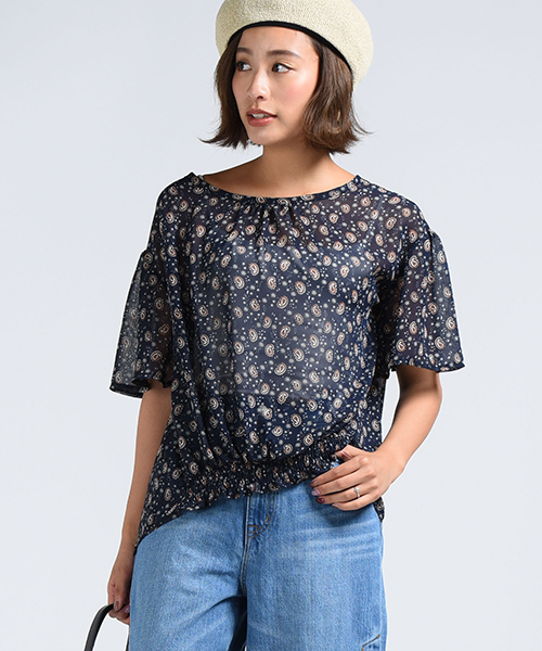 爽やかなペイズリー柄が季節感たっぷりなフレアスリーブブラウス。透け感のある軽やかな素材感が女性らしい♪後ろは長めにとり、フロントはギャザーをたっぷりとったキュートなシルエットに仕上げました。前からみても後ろから見られても抜かりない!バックはVに開いたカットでさりげない肌見せが魅力的♪ワイド系のボトムと合わせて爽やかに♪・同シリーズにワンピース(商品番号:6101-72018)があります。
