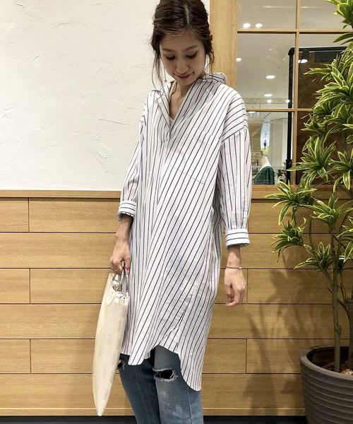 今季のトレンドのシャツワンピース。ハリ感や、深めに開いたスキッパーデザインが大人な着こなしにマッチ。袖はふんわりと女性らしく、抜け感のあるシルエットに仕上げました。長すぎず短すぎずの、バランスがとりやすい丈感でボトムは選ばず、オンオフ問わず活躍してくれます!オフスタイルには、レギンスを合わせたラフでこなれ感のあるスタイリングにするのもオススメ!