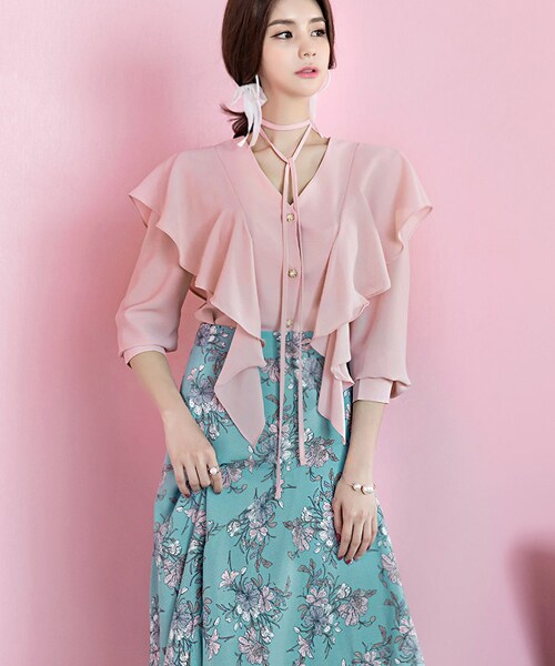 DINT(ディント)の「ホリックパールのボタンラッフルブラウス(シャツ/ブラウス・レディース・핑크/화이트/옐로우・one(44~66size))」の1枚目の写真