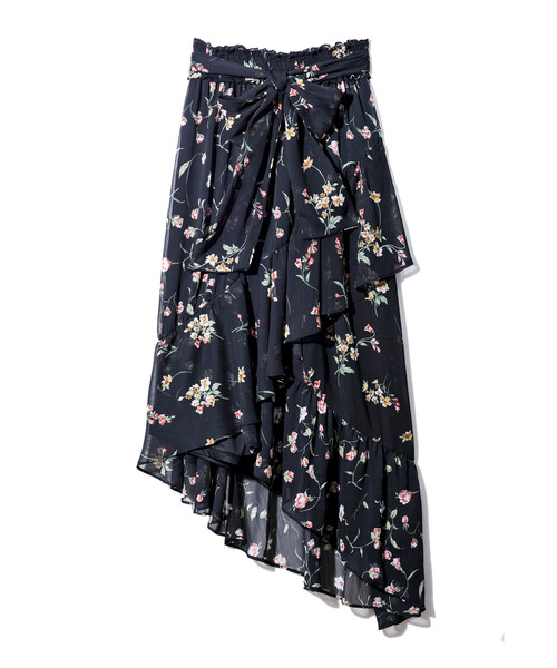 ◆アシンメトリーなラッフルデザインがポイントのフラワープリントのシフォンスカート♪軽さのあるシフォンの生地をたっぷり使っているので、歩くとふんわりと揺れて、可愛さ満点◎カラーは、ブラックとホワイトの展開。甘さのあるデザインなので、夏のモノトーンコーデにオススメ!