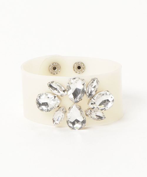夏コーデを彩ってくれるビニール素材のブレスレット。 透明感のある涼やかな風合いと、ビジューの輝きが絶妙にマッチ! スナップボタンで簡単に着け外し可能です。