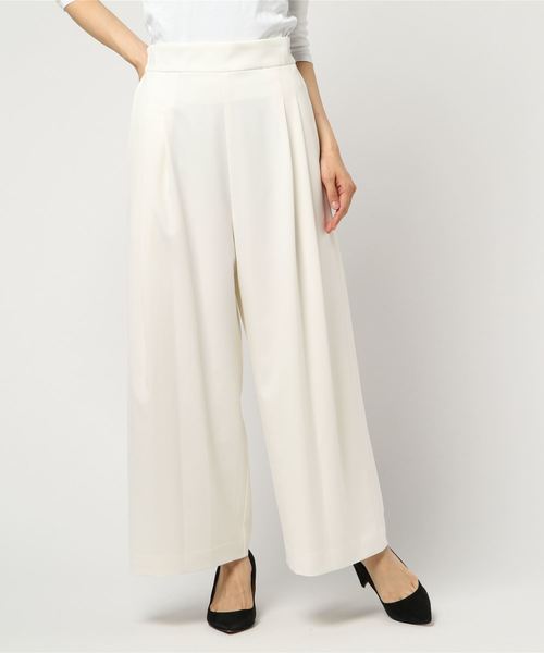 ボリューム感のあるシルエットで、トレンドライクなスタイルが楽しめるワイドパンツ。 フロントにはタックを施し、上品な女性らしい印象を演出してくれます。 バックウエスト部分はゴム仕様なので、ストレスフリーな着心地も魅力的。 普段使いはもちろん、オフィスシーンでも活躍出来るアイテムです。