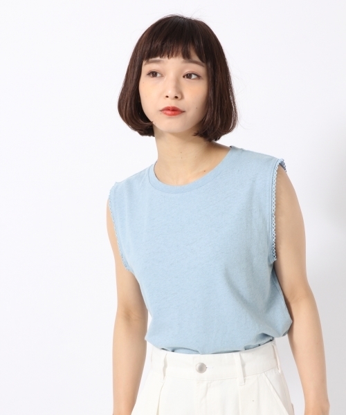 オーガニックコットンを使用した可愛いノースリーブ!! 麻混なので春夏にピッタリな通気性のいい、さらっと涼しいノースリーブ!!! 有機栽培綿のオーガニックコットンを使用した柔らかい肌触りのアイテム。 さりげなくなみなみのデザインレースを袖に施しフェミニンな印象に♪ 合わせやすいベーシックカラーに、淡いピンクやブルーもご用意してます☆