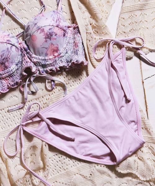 サイドのリボンを結んで着用するタイプの、定番のボトムです。 後ろの股上を少し深めに設定することで、かがんでもお尻が見えずらくなっております。 トップのブラを選ばないシンプルな形ですので、1つ持っていただければブラ次第で様々なビキニコーディネートが楽しめます。 定番の無地のタイプの他に、少しひねりを加えたレースタイプもございます。 レースタイプはビキニコーディネートがより一層華やかになります。 一つは持っておきたい、オススメのボトムになります。 *撮影場所やイメージにより実際の商品と色味が若干異なる場合がございます。商品のお色味はカラーバリエーション画像をご参照ください。 こちらのビキニは上下別売りですので、お好みのビキニコーディネートをお楽しみください。 また全ての水着に、厳選した滑らかで肌触りの良いマットな素材を使用し、その素材を裏表両面に用いることで着心地の良さを高めています