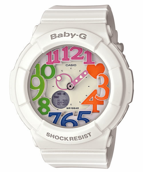 アクティブな女性のためのカジュアルウオッチBaby-Gから、内蔵のブラックライトに反応して針・文字などが発光するネオンイルミネーターを搭載した「Neon Dial Series(ネオンダイアルシリーズ)」が登場。 ファッションに合わせやすいモノカラーをラインアップ。ライト点灯時には、立体的に配置された大小のインデックスや針などが暗闇でカラフルに浮かび上がり、Baby-Gらしい遊び心を表現します。また、インパクトのあるビッグケースを採用し、カラーをより主張するデザインに仕上げました。ファッションのアクセントとなるNew Style Baby-Gです。 ●耐衝撃構造(ショックレジスト) ●10気圧防水 ●ワールドタイム ●ストップウオッチ ●タイマー ●時刻アラーム5本(1本のみスヌーズ機能付き)・時報 ●フルオートカレンダー ●12/24時間制表示切替 ●ネオンイルミネーター(紫外線領域発光のLEDライト、残照機能付き)