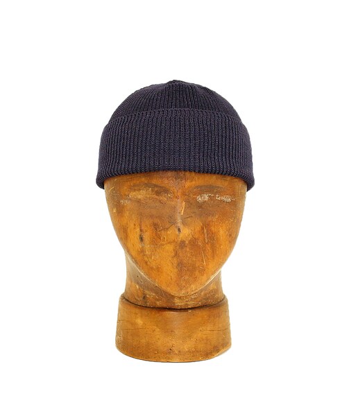 シャリ感のあるコットン糸で編んだWATCH CAP(D-00230同糸)。 1940年代のUS.NAVYを参考に制作。 この年代のものが一番手の込んだ作りのニット帽子。 天井は総針編み、中間部分は片畦編み、被り口(裾)は片畦振り編み。 大量生産に差し掛かるもので縫製は2本針ロックミシンで制作しています。縫製糸も綿糸で縫製。 裾を2ロールして深く被ることで当時の雰囲気を感じることができます。
