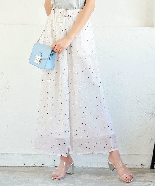 Dカンベルトデザインがポイントのワイドパンツ。ドット柄or花柄の選べる2デザイン。【素材・サイズ感】さらりとしたシフォン素材で穿き心地がよくデイリー使いし易い一枚です。ハイウエスト×Dカンベルトで全体を引き締めてスタイルアップ。足首がすっきりと見える丈感なので、ヒールとの相性も◎【スタイリング】シンプルなトップスを合わせるだけでカッコよく決まるコーデの主役級アイテムです。※【伸縮】バックウエストあり/【淡色透け】裏地部分なし/【濃色透け】裏地部分なし/【裏地】あり