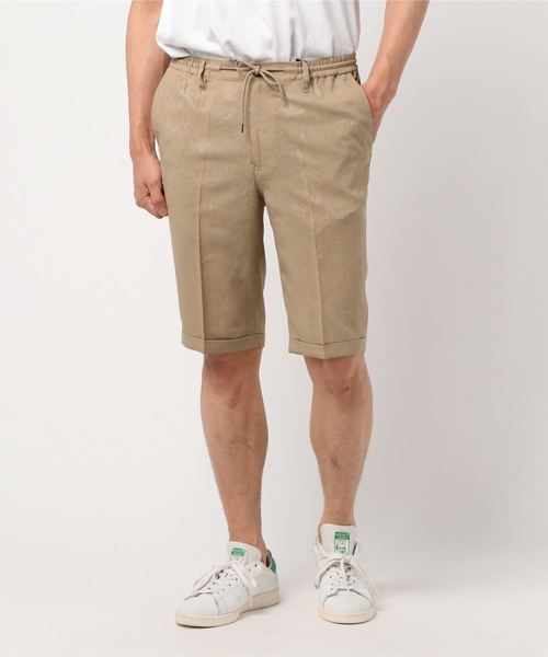 一見無地に見えますが実は、平織りハイビスカス・エンボス(型押し)生地で仕立てたショートパンツ。高級感のある光沢と艶、そして角度により浮き出るボタニカル柄のエンボスが特徴です。 ウエストはゴム&紐のらくちんイージー仕様。 ゆったりとした腰回りから膝丈の裾まで太すぎず細すぎないスッキリとしたリラックスシルエットで、様々なタイプのトップスに合わせやすいスタイリッシュなオトナの遊び着に仕上がっています。 問い合わせ番号:31837713 とセットアップできます。