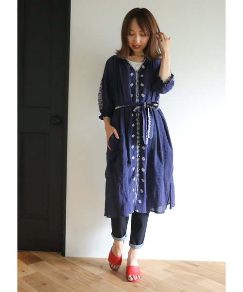 ドビー織りの生地の上にさらに刺繍を施しアクセントにしたインドならではのガウンワンピです。同じ刺繍の入った共布ベルトでウエストをマークしてブラウジングしたり、後リボンにしてバックスタイルのポイントにしても。[クリーニング]手洗い可ドライクリーニング可(F)ウェットクリーニング(W)
