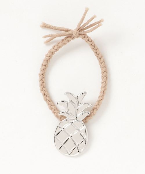 パイナップルモチーフのフルーツヘアゴム。夏気分を取り入れられるので、いつものコーデのアクセントになります。編み紐風のゴム部分も珍しく、手首に付けてもポイントになります。