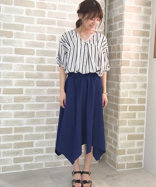 イレギュラーヘムデザインが今っぽいスカート。柔らかい風合いの生地とウエストのギャザーによって、ほどよいボリューム感ときれいなシルエットを作り出しています。バックウエストはゴム仕様なので、リラックスした着心地なのもうれしいポイントです。