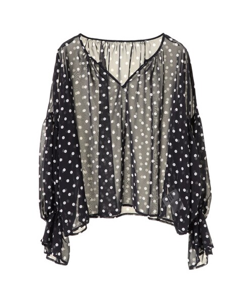 軽やかな透け感がフェミニンなドットブラウス。 ざっくり開いたネックラインが抜け感を与え、ほどよい肌見せがヘルシーな色気を醸し出してくれます。 キャミソールやタンクトップをインナーにするのはもちろん、ノースリーブワンピースと重ねるのもおすすめです。