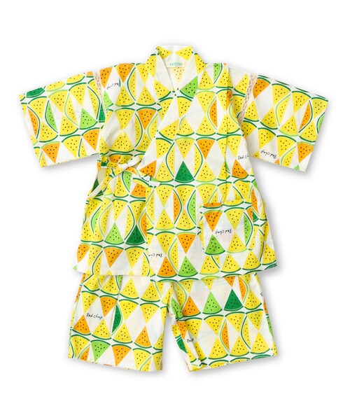 POPなカラー使いが目を引くすいか柄甚平です。さらりとした着心地で暑い夏でも快適に使える素材を使っています。浴衣とのペアもオススメです。