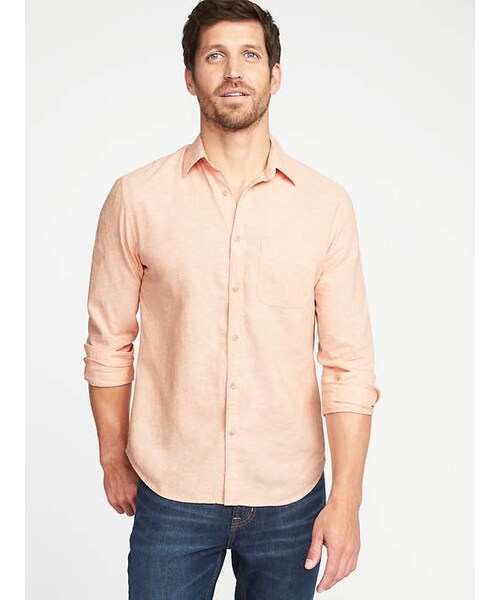 45% cotton, 55% linen . Machine wash. Imported. Online exclusive! Pointed collar. Long sleeves, with buttoned cuffs. Patch pocket at chest. Seven-button placket. Soft, medium-weight linen blend. Slightly fitted through body. Shirt hits below waist. Model is approximately 6'1" and wears a size M.