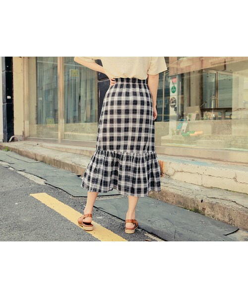 ひざ下の丈感で気軽に着用頂けます。裾のシャーリングでボリューム感をプラス!全体にチェック柄をあしらいスカート1つでコーデの完成度を高めれる優秀アイテムです♡ウエストゴムで長時間の着用もラクちん♪女性らしい演出にぴったりのロングスカートです。