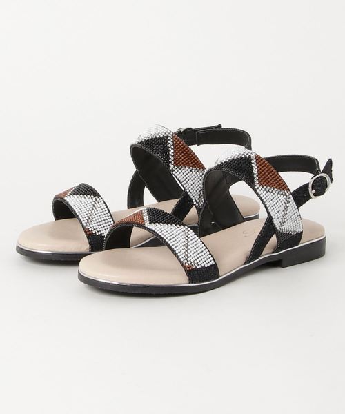 ビジュービーズとソールまわりのシルバーカラーが華やかなフラットサンダル。隠しゴム付のバックバンドでさっと履ける!クッション性のある中敷きで足あたりも◎。■対応サイズ/S(22.5cm)M(23.0~23.5cm)L(24.0cm)LL(24.5cm)■ ソール高さ/約1.5cm■ 3E程度■ ベルト隠しゴム仕様※ 商品の特性上、色・柄の出方が多少異なる場合があります。※ 柄ものは左右の柄の出方が異なります。