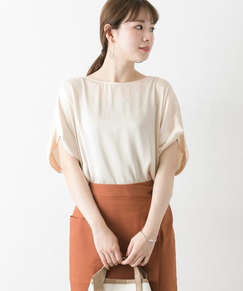 【滑らかなサテン素材が美しい大人の1枚】柔らかく落ち感のあるヴィンテージサテンを使用。上品な光沢があり、さらっとした肌さわりで着心地の良い1枚に仕上げました。またロールアップ風のお袖のタックがポイント。柔らかな素材のため自然にドレープが入り、袖口に動きを与えます。POINT・ゆったりとしたサイズ感で抜け感を演出・二の腕をカバーする長めの袖丈・ご自宅で手洗いが可能COORDINATEきれいめなスカート合わせはもちろん、あえてリネンパンツやスカートに合わせてカジュアルアップさせるのもオススメです◎※透け感あり※この商品は、素材の特性上、着脱時の際やアクセサリー等で引きつれ、引っ掛かりやすい為、取扱いにはご注意ください。また、強い力などがかかると縫い目が開いたり、目寄れがおこることがありますので、お取り扱いの際はご注意ください。※その他お取り扱いに関しましては、商品に付属のアテンションタグをご確認の上、充分ご注意ください。
