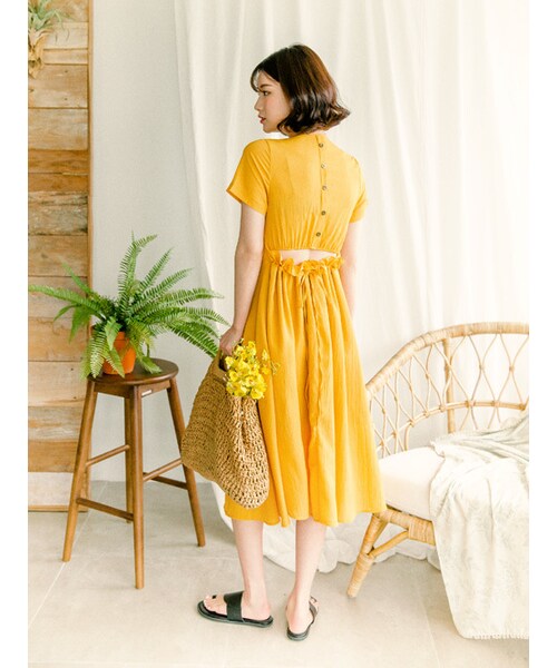 ウエストバックがカットされ ユニークなワンピース。 背中はストリングディテールで 安定感も与えています* 大人な長い丈感も魅力的。 フレアスカートデザインが爽やかな印象もあり、 夏にピッタリな半袖ワンピースです。
