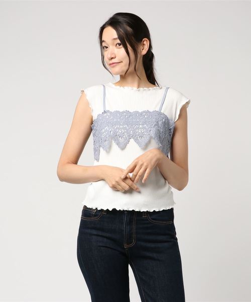 ■着回し力抜群のセットアイテム☆■ シンプルなリブのタンクトップとレースキャミソールのセットになっています。 タンクトップはほどよいフィット感があるのでサロペットやジャンスカのインナーとしてもオススメです。 レースキャミはプリントTやハイネックのアイテムと重ねてもアクセントになります。 セットでも別々でも今っぽく着まわせるオススメアイテムです♪