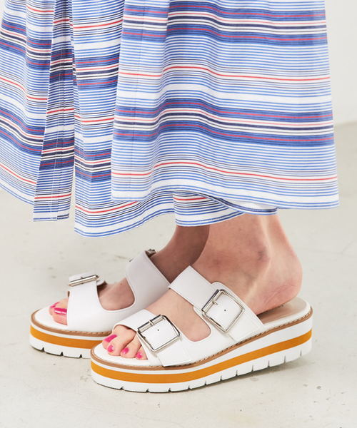 今年らしいスポーティさと、厚底のコンフォートデザインがミックスしたサンダル。モードなダブルベルトもホワイトのヒールにカラーラインを挟むことでポップな印象に仕上げ、マットな素材で高級感もプラス。カジュアルなソックスレイヤードもしやすい1足。 【オススメPOINT】 ◇ブラックはマットなサテン地で他とは違ったスポーティアイテム ◇派手なソックスやペディキュアで色を足すとよりお洒落な雰囲気に