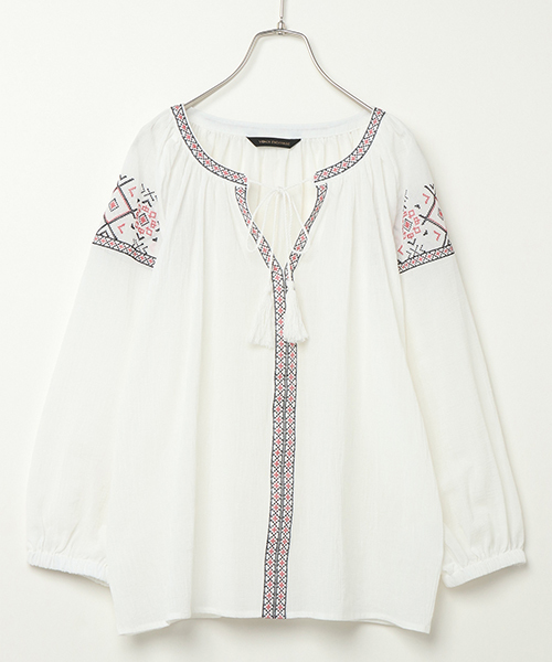 クロスステッチ刺繍をあしらったボヘミアン調のシャツブラウス。 シャリ感のあるやわらかなコットンカーゼ素材はほんのり透け感があり、軽やかな印象を与えてくれます。 胸元とタッセル付きリボンがアクセント。 コーディネートの主役になる、これからの季節にぴったりなおすすめアイテムです。 [クリーニング] 洗濯機洗い可(非常に弱く) 洗濯の際はネットを使用してください。