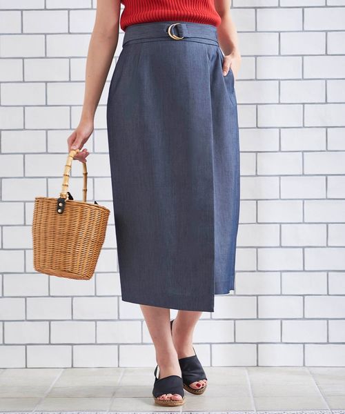 - 決まり過ぎない抜け感が魅力のラップスカート - 程良い光沢と落ち感のリヨセル素材がきれいめなラップスカート。 取り外し可能なDカンベルト付きで、ベルト無しでも腰高に見えるハイウエストのデザイン。 スッキリとしたストレートシルエットで、ギンガムやドットなどトレンドの甘めトップスと合わせても、大人っぽく決まります。
