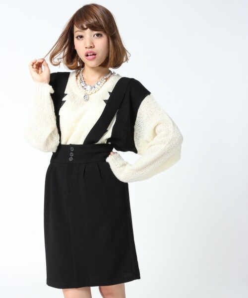 雑誌でよく見るサスペンダー付きスカート。こちらは長め丈のペンシルスカートなのでトレンド感が更にUP☆プチハイネックやウラケトップスとあわせるとより今年らしいスタイリングの完成!!取り外し可能なサスペンダーなので着まわしの幅が広がります!!