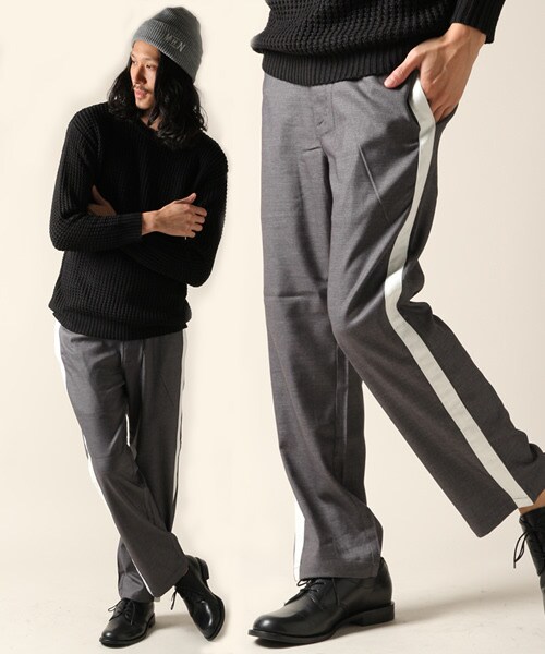 サイドにラインをあしらうことで、スポーティテイストに仕上げたスラックス生地のパンツ。細すぎず、太過ぎないスッキリとしたレングスラインを採用し、綺麗なシルエットに仕上げています。程よい光沢感を持たせたスラックス生地を使いながら、センタープレスは入れてないので、カジュアルボトムスとしてお使い頂けます。プルオーバーニットや、スウェットなどと合わせるのがオススメです。
