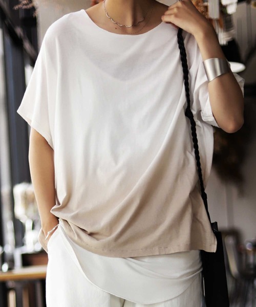爽やかに印象付ける、ムラ染めの魅力。ムラ染めTシャツの登場です!これからの季節に取り入れたいのはこんなお洒落なムラ染めアイテム。裾から自然な風合いで染め上げられたトップスは一枚着るだけで雰囲気抜群の装いをお約束します。素材は綿レーヨンのしっとりと、上品で上質感のある大人っぽい風合いなんです。前ネックはラウンドネックの見返し襟始末ですっきりと上品な印象に。アクセサリーも映えるのでコーデが楽しくなりますよね。肩はストンと落ちるドルマンシルエットで、しっかり二の腕も隠してくれるから、二の腕が気になる方にも嬉しい丈感。一枚でモードにもカジュアルにも着こなせる万能トップス。今季の着回しに一枚持っておきたい一着です。※お届けした直後、見返し襟の特性上アタリ(表面に型が付く現象)が起こりますが時間経過やお洗濯で消えるものですので汚れや不良では御座いません。ご了承の上お買い求め下さいませ。※こちらの商品は染色過程上、色ムラや色飛びなどがある場合がございます。ご了承の上お買い求め下さいませ。