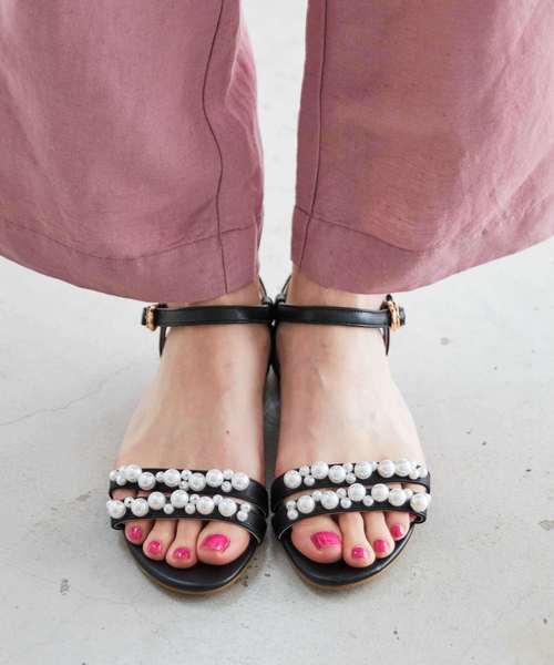 細ストラップに、大小MIXさせたパールが印象的なフェミニンサンダルはフラットの形を採用する事でほどよくカジュアルダウン。かかとにはゴールドヒールをあしらいモード感をプラスしディテールにこだわったアイテム。リネン素材の服にさらっと合わせても可愛い1足。 【オススメPOINT】 ◇ラスト、デザイン共に華奢に仕上げたフェミニンアイテム ◇あえてのベーシックカラーでパールを活かした色展開