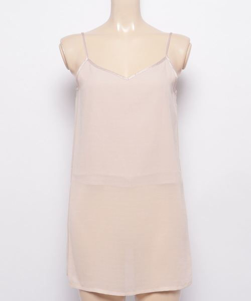 シンプルなワントーンカラーで仕上げたキャミソール。裾のスリットでトレンド感を演出し、デコルテを美しく魅せるVネックが女性らしい印象を与えます。胸元部分は裏地が付いているので安心して着用でき、涼しげなデザインがこれからの時期にピッタリです。