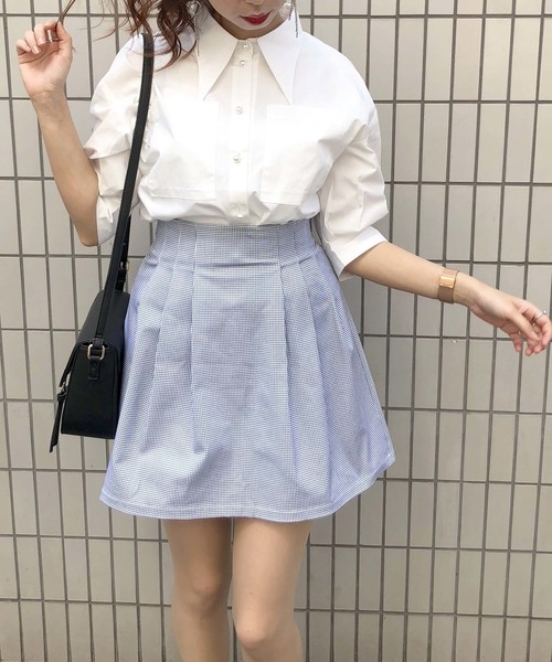 ■大き目の襟がアクセントになったパフスリーブブラウス■ ボタンのパールが女性らしさを演出してくれ、細かなディテールにこだわった1枚。 甘くなりすぎないボリューム感抑え目なパフスリーブは五分袖まである安心感も♪ コンパクトな丈感でワイドパンツやタイトスカートなど、どんなボトムともバランスよく着用して頂けます。綿100%で通気性も抜群です◎