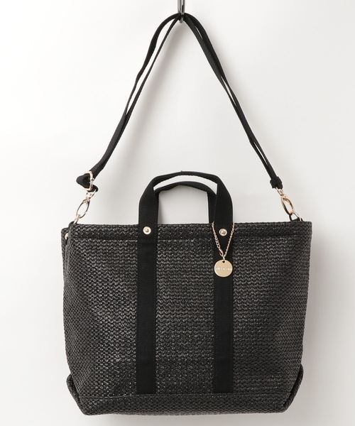 一見シンプルなトートバッグですが、持ち手の部分にはキャンバス地を、ボディには雑材調の生地を使用しています。天然素材ではございませんので、衣服を傷つける心配がございません。口元はファスナーで開閉するため、中身が丸見えになることもなく安心です。きらきらのゴールドがかわいいチャーム付きです。