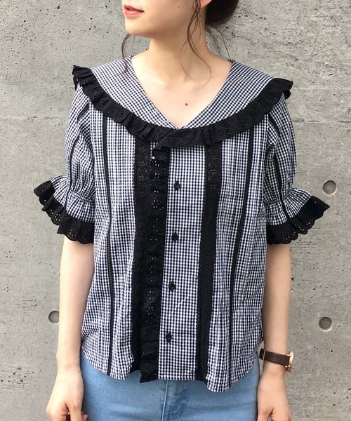 ~NICECLAUP 2018 summer Collection~■ZOZOTOWN限定アイテム■セーラーカラーがかわいいフリルたっぷりのコットンブラウスが登場!トレンドがぎゅっと詰まったガーリーなデザイン。衿と袖、フロントにカットワークのレースがたっぷりと♪身頃にも数種類のレースがふんだんに使用され、限定アイテムだからこそ贅沢に仕上げました。なんとボタンサイドのレースは♡モチーフに。■スタイリング甘めなモチーフなので、敢えてのデニムパンツやワイドパンツとコーデしても◎今年ならサロペットのインナーとしてもセーラーカラーを活かせます。もちろん台形スカートや、トレンドのギンガムチェック、ドット柄などのフレアミニボトムを合わせてガーリースタイルを完成させるのもおすすめ♪