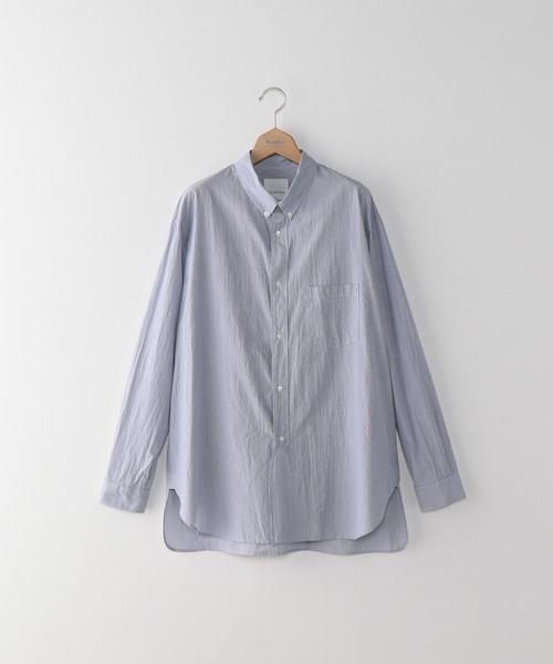 極細のストライプを用いたシャツ。遠目には無地のようにも見えて着こなしやすいデザインです。適度なゆとりのあるシルエットのプルオーバー仕様。衿元はトラディショナルな印象のボタンダウンを採用しています。綿100%素材で肌触りが柔らかく、着心地の良さも魅力です。<STILL BY HAND>「いまだに手で」という意味。 国内生産にこだわり、素材、シルエット、ディテールワークなど、着ていく中で初めて気づくような、小さな工夫を盛り込んだ洋服作りをテーマとしている。店舗へお問い合わせの際は、全国のSteven Alan 各店舗まで下記の品名/品番をお申し付け下さい。品名:SA SBH 11 LONG SHT 品番:8175-599-0095