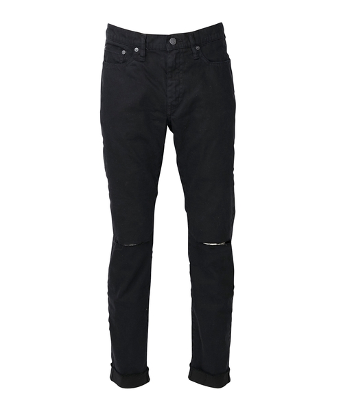『ストレッチ性を活かしたスリムパンツ』 丁寧に穿き続けたようなフェード感を再現したUSED加工です。 夏らしく両ひざ穴に、裾はカットオフ仕様で軽い雰囲気に仕上げました。 スタイリッシュなスリムフィットのデニムは、全身をタイトにまとめることで、よりエッジィでモードな印象に。上品なテーラードジャケットやシャツ、さらに今年らしさを演出するならスッキリとしたオープンカラーシャツもオススメです。またボリュームのあるトップスを選び、上下のシルエットでメリハリをつけると、いっそう旬のバランスに。アウターやシャツ、Tシャツを問わず、あえて1~2サイズアップで合わせるだけでも今っぽさが倍増します。 ◆強撚ハイストレッチ タテ糸に強撚糸、ヨコ糸には伸張回復率に優れたハイブリッド糸を使用したストレッチツイルです。 ソフトで快適なストレッチ性と強撚糸使いによるドライ感が特徴です。 さらにひざ抜けを抑える高い形状保持性能も併せ持った素材です。