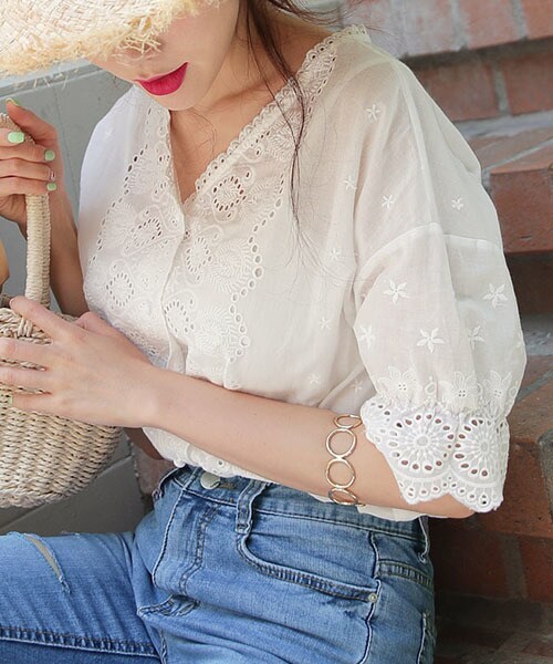 清涼感あるカラー感と繊細なパンチングディテールでよりムードアップしたデザインに。ロマンチックな印象が魅力的。 半袖でボディも窮屈感がなくくるみボタンもさり気なく+♪V字ネックスタイルで甘さと品を取り入れたアイテムで袖はスカラップヘムに完成。 ※WEARに記載してある金額と、DHOLIC通販サイトに記載してある金額にシステム都合上、稀に誤差が生じます。正しい金額はDHOLIC通販サイトに記載された金額です。
