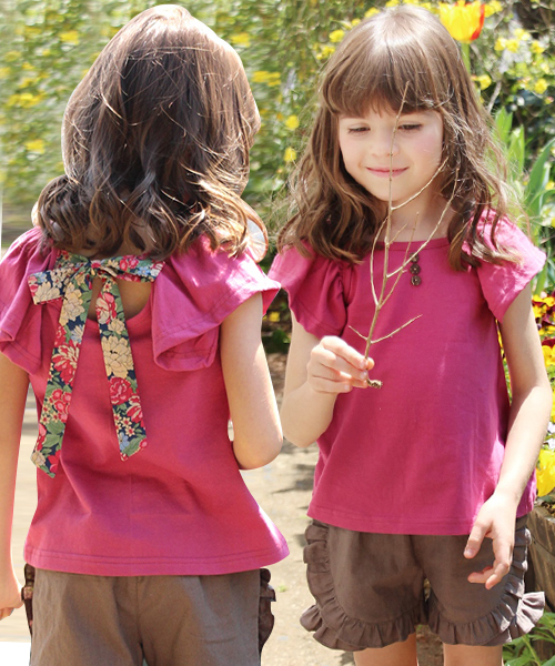 ・モデルサイズ:モデル7歳 Weight:18.5kg Height:118cm・モデルの着用サイズ:110cm・説明:無地のチュニックに花柄リボン、風になびく葉っぱのような、バタフライのようなひらひら大きな袖口のフリルが夏のナチュラルな気分に誘う子供チュニックtです♪可愛く広がるAラインがふんわりおとなっぽい!長い丈のスキニーとや短い丈のショートパン、スカートと合わせるだけでママに負けないキッズならではのナチュラルカジュアル夏コーデを即完成してくれます★シンプルながらレトロな色使いや女の子らしい褒められデザインがいつものコーデが個性的に!これからたくさんの夏のおしゃれができそう!