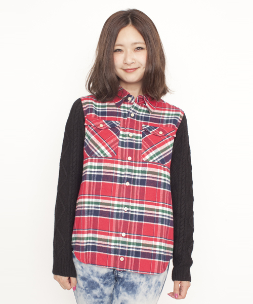 オリジナルチェックネルに、ケーブル編みのニットになった袖がおしゃれな異素材使いのアイテム!一枚でおしゃれ上級者になれちゃう!定番のチェックネルだからこそ、みんなとは差を付けて!!左腕にはマイクミルズのワッペン付き★ ※画像の商品はサンプルです。 実際の商品と仕様、加工、サイズが若干異なる場合がございます。 model:身長163cm 着用サイズ:1