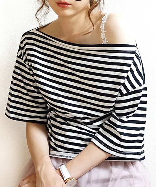 カジュアルな印象になりやすいボーダー柄を、ボートネックが大人な雰囲気に格上げしてくれます。 オフショルや、片方の肩出しなども幅広く楽しめそうです。 長めの半袖〜5分袖程度の袖丈があり、気になる二の腕はしっかりカバーしてくれます。しっかりストレッチがきいた、しっとり素材なので、着心地もラクラクです。