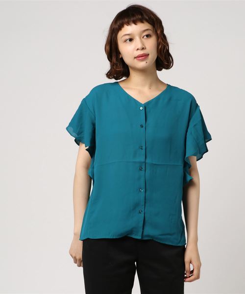 とろみのある素材感がフェミニンでエレガントなブラウス。ボリュームのあるフリルスリーブが二の腕をカバーしてくれ、腕を細く見せる効果も期待できます。上品で清楚な印象を与えてくれ、オンオフ問わず幅広いシーンで活躍してくれる優秀なアイテムです。