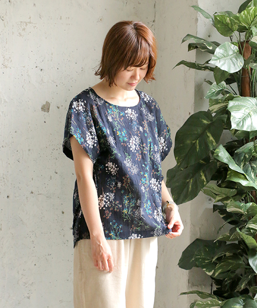 やさしい草花柄のプリント生地の上にさらに刺繍を施しているので、1枚でも主役級のデザインブラウスです。 袖リボンをきゅきゅっと絞ればフェミニンな印象に。 絞らなければ風通しよく涼しく着て頂けます。 [クリーニング] 手洗い可 ウェットクリーニング(W) 洗濯の際はネットを使用してください