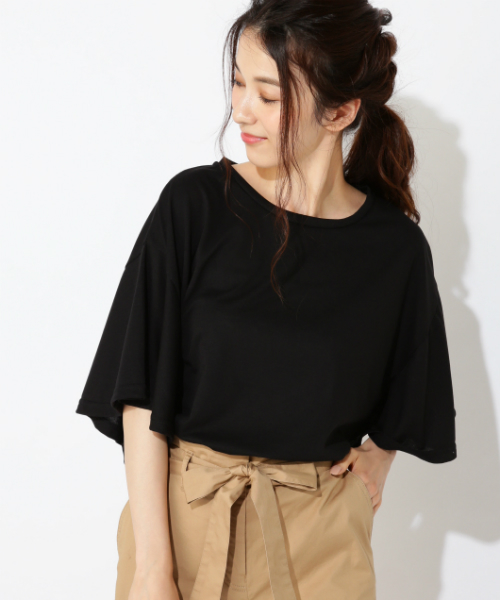 適度な落ち感のある素材を使用した、ドレーピーなシルエットが自慢のプルオーバーカットソー。ドロップショルダーから広がるボリュームたっぷりのフレアスリーブが、今年らしいこなれ感を演出してくれます。身体が泳ぐくらいにゆとりを持たせているので、さりげなく体型カバーを叶えてくれるのも嬉しいポイント。二の腕をすっぽり隠す袖丈も◎。