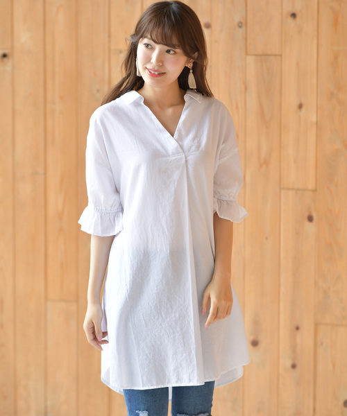 袖コンシャス&開襟で旬顔に☆ 旬のテイストが詰まったロングシャツワンピース。 抜け感たっぷりの開襟シャツデザインでデコルテを美しく演出します。 ドロップショルダーからのきゅっとゴムで絞ったキャンディスリーブが手元を華奢で女性らしい印象に。 マニッシュなムードの中に女の子らしい要素が詰まったアイテムです♪ スリムなパンツですっきり着ても、ワイドなパンツでルーズなコーデも◎。 ※オフホワイトは無地、ホワイト系その他2とネイビーはストライプ、 ブラックはギンガムチェックになります。 裏地なし 伸縮性なし 薄手(1枚では透けます) 袖口ゴム仕様 生地の取り方でデザインに個体差が生じます 織りキズやだま等みられる場合もございます 洗濯:洗濯機使用可(ネット使用)