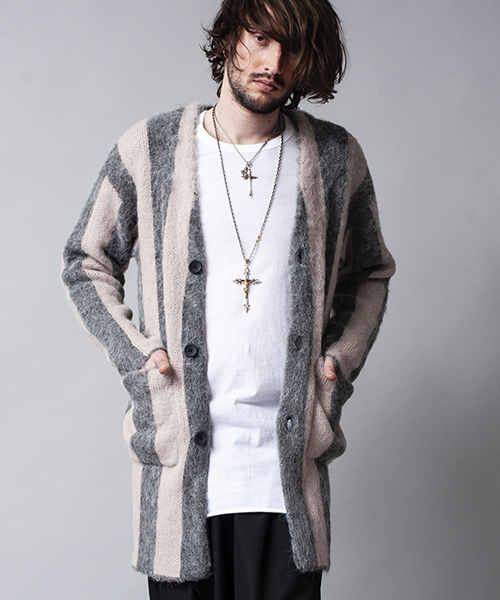 毛足の長いシャギーニットを使いウォーム感のある風合いに仕上げた本作。 少し着丈を伸ばしハーフコート感覚で羽織れる気軽な一枚。 太めのピッチで作られたストライプ状のジャカード編みは縦のシルエットを強調。 Tシャツにデニムのラフなスタイルからシャツとトラウザーズでモードな雰囲気にも使える一着となっている。