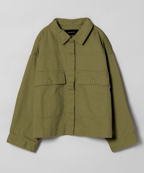 スタンダードな2ポケットのミリタリージャケット。バイオウォッシュ加工でカジュアル過ぎないビンテージ感を表現しています。フロントはボタンを見せない仕様にしていることで、すっきりとした大人っぽいディテールに仕上げました。短丈なので、ボトムスはロングスカートやワイドパンツなど相性抜群です♪♪