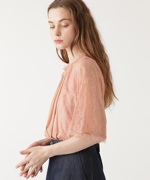 PRE-FALL 2018 華奢なレースと楊柳シフォンがドッキングしたブラウス。襟ぐりや袖口にカットワークされた繊細なレースやフロントタックなど、細部までフェミニンな雰囲気に。いつもとは少し違うコンビデザインでヌケ感のある仕上がりです。スカートはもちろん、デニムに合わせてラフにも着こなせます。スタイリングに投入するだけで、女性らしく格上げできるアイテムです。
