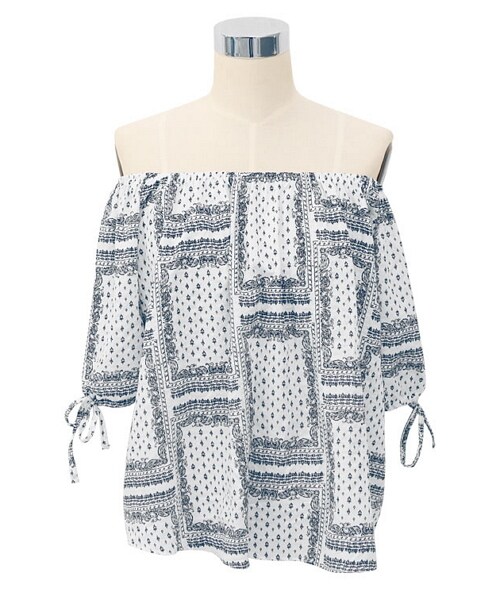 爽やかなバンダナ柄のオフショルブラウスが新登場!! ラブリーな肌見せアイテムで色っぽスタイルを叶えます♬ 袖口にはストラップを添えてふんわりボリューミーなシルエットを演出☆ シンプルなボトムとの上品なカジュアルスタイルがおすすめ◎